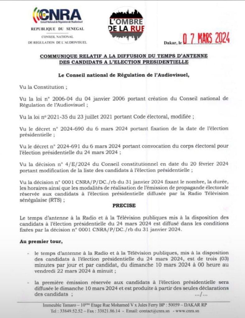 Le temps d’antenne à la Radio et à la Télévision publiques mis à la disposition des candidats à l’élection présidentielle du 24 mars 2024 est diffusé dans les conditions fixées par la décision n° 0001 CNRA/P/DC./rb du 31 janvier 2024.