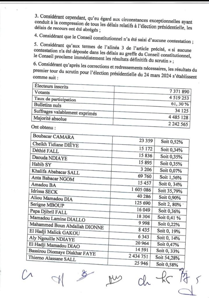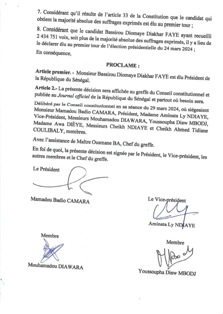 « Le candidat Bassirou Diomaye Diakhar FAYE ayant recueilli 2 434 751 voix, soit plus de la majorité absolue des suffrages exprimés, il y a lieu de le déclarer élu au premier tour de l’élection présidentielle du 24 mars 2024; En conséquence, Monsieur Bassirou Diomaye Diakhar FAYE est élu Président de la République du Sénégal », lit-on dans la décision du Conseil constitutionnel.