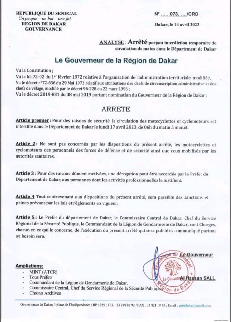 “[…] Article premier: Pour des raisons de sécurité, la circulation des motocyclettes et cyclomoteurs est interdite dans le Département de Dakar le lundi 17 avril 2023, de 06h du matin à minuit.