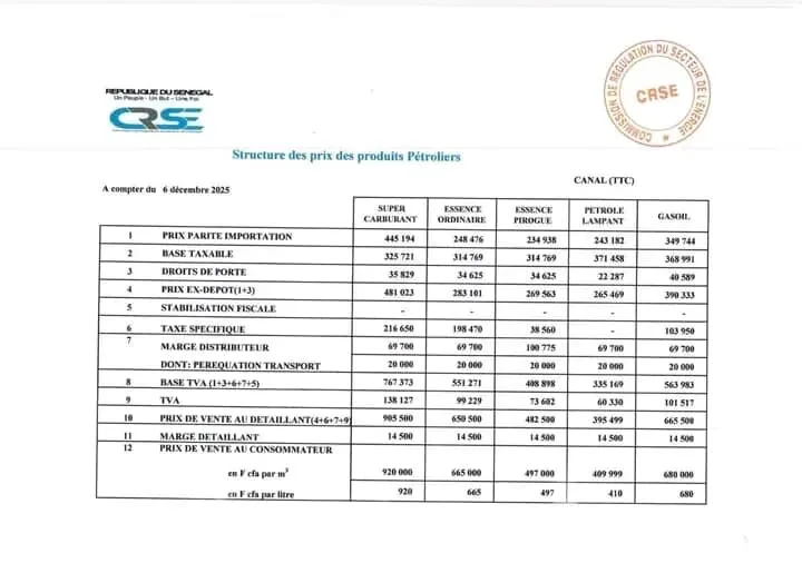 Très bonne nouvelle après l’annonce des autorités. La Commission de régulation du secteur de l’Énergie (Crse) a annoncé une baisse des prix des produits pétroliers, effective à partir du samedi 6 décembre 2025 à 18h.
