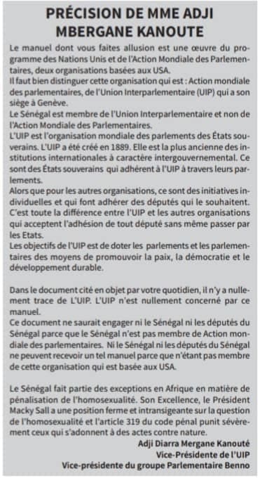 Réagissant aux informations d’un journal de la place, selon lesquelles des députés du Sénégal membres de l’Union interparlementaire (UIP) auraient entre leurs mains un document de propagande de l’homosexualité, Adji Mergane Kanouté, vice-présidente de ladite institution parlementaire, apporte des précisions.