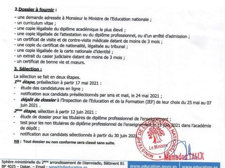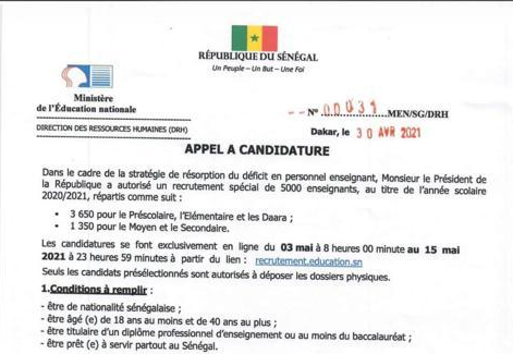 Le ministère de l’Education lance un appel à candidature dans le cadre de la résorption du déficit en personnel enseignant initiée par le chef de l’Etat pour un recrutement spécial de 5000 enseignants au titre de l’année 2020-2021. Les précisions dans le document ci-dessous, des services du département dirigé par Mamadou Talla :