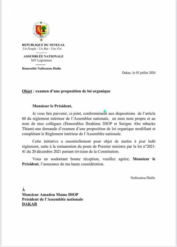 Cette initiative, signée par la parlementaire Nafissatou Diallo de la coalition Wallu et ses collègues Ibrahima Diop et Serigne Abo Mbacke Thiam, s’inscrit dans le cadre de l’article 60 du règlement intérieur de l’institution, renseigne un texte.