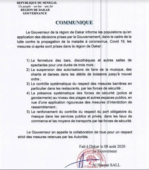 Le gouverneur de la région de Dakar, Al Hassan Sall a sorti un arrêté pour mettre en application les mesures prises vendredi par le ministre de l’Intérieur et de la sécurité publique Aly Ngouille Ndiaye. Ce, pour mettre fin à la propagation de la maladie à coronavirus.