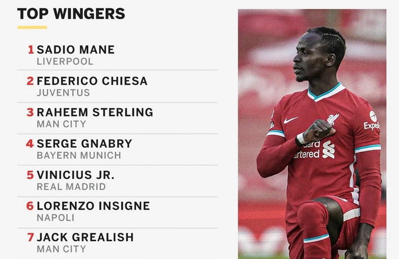 La chaîne de sports ESPN a publié son classement annuel des meilleurs joueurs. Sadio Mané, meilleur ailier de l’année, selon ESPN. L’attaquant international sénégalais devance dans le classement Federico Chiesa (Italie, Juventus) et Raheem Sterling (Manchester City, Angleterre), respectivement 2e et 3e.