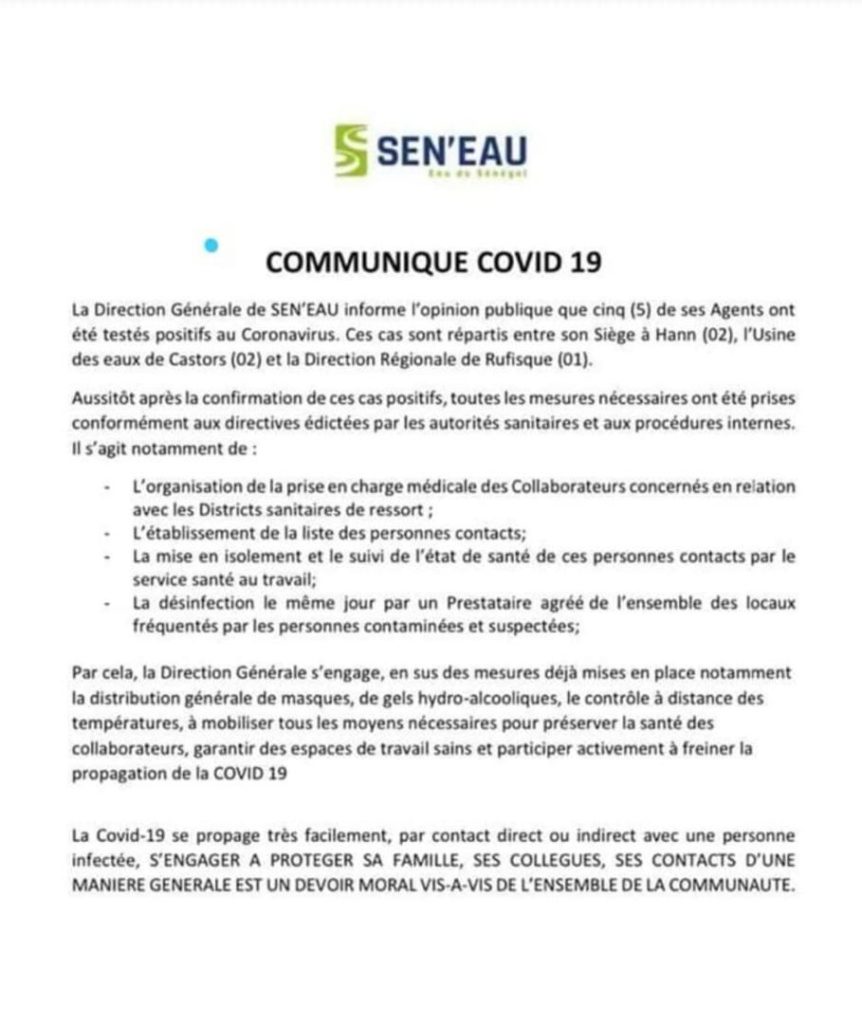 Dans le document ci-dessous, la société nationale de commercialisation de l’eau dans les milieux urbains et péri urbains informe que cinq de ses agents ont été testés positifs au coronavirus.