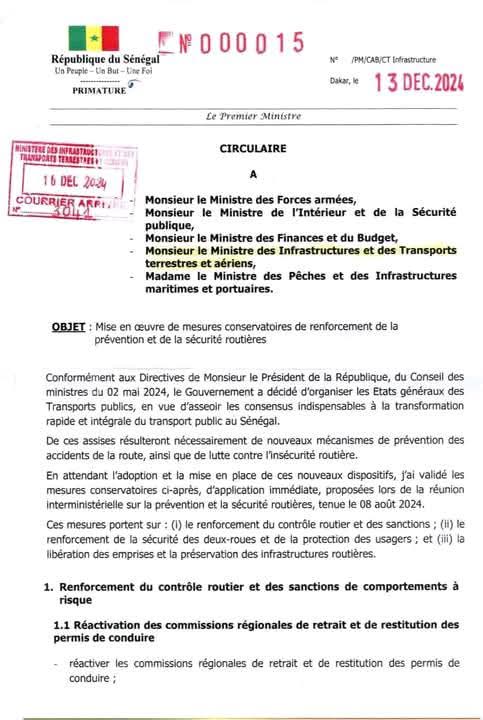 Le gouvernement a annoncé la mise en place de mesures conservatoires pour renforcer la prévention et la sécurité routière. Une circulaire adressée aux ministres concernés a été signée par le Premier ministre, conformément aux directives du président de la République.