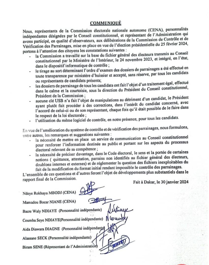 “Nous, représentants de la Commission électorale nationale autonome (CENA), personnalités indépendantes désignées par le Conseil constitutionnel, et représentant de l’Administration qui avons participé, en qualité d’observateurs, aux délibérations de la Commission de Contrôle et de Vérification des Parrainages, mise en place en vue de l’élection présidentielle du 25 février 2024, portons à l’attention des citoyens les constatations suivantes :