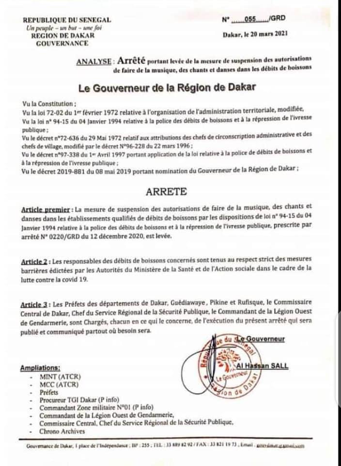 Actualités Société Suspension des autorisations sur la musique, les débits de boisson… : Les précisions du Gouverneur de Dakar 20 mars 202120 mars 2021 jotalixibar Partager l'article Partager : Cliquer pour partager sur X(ouvre dans une nouvelle fenêtre) X Cliquez pour partager sur Facebook(ouvre dans une nouvelle fenêtre) Facebook Cliquez pour partager sur WhatsApp(ouvre dans une nouvelle fenêtre) WhatsApp Share Facebook Twitter Pinterest Linkedin