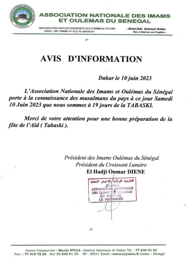 Il n’y a plus de doute. La fête de l’aid-el-kebir sera célébrée dans 19 jours à compter de ce jours, soit le 19 juin prochain. C’est du moins ce qu’a laissé entendre l’imam Oumar Diène, président de l’association des imams et oulémas.