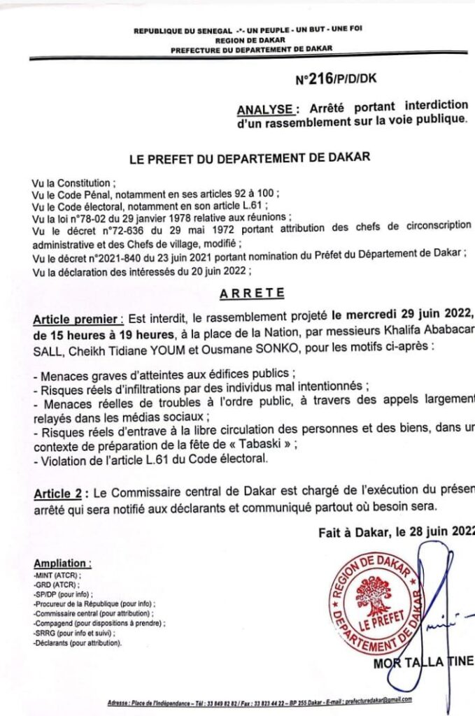 A Kaolack, les motifs le préfet parle de “non-respect du délai de déclaration prescrit par la réglementation, renseignements relatifs à l’identification des déclarants incomplets et menaces de troubles à l’ordre public”.
