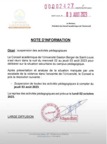 Le Conseil académique de l’Université Gaston Berger de Saint-Louis s’est réuni dans la nuit du mercredi 02 au jeudi 03 août 2023 pour délibérer sur la situation sécuritaire du campus pédagogique.