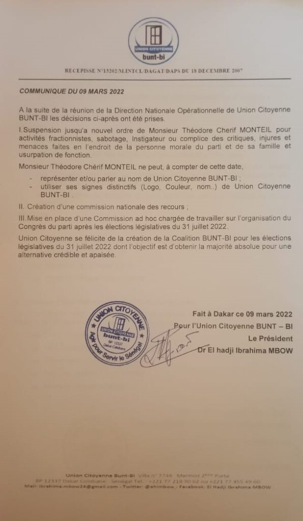 Le député Théodore Chérif Monteil vient d’être exclu de toutes les instances du parti Union Citoyenne Bunt-Bi pour des fautes “lourdes et répétées”. C’est du moins ce qu’a prononce ce mercredi 9 mars 2022 à la suite de sa réunion le parti. Le parti s’est réuni pour statuer définitivement sur le sort de leur camarade qui commis des fautes contraires aux normes du Parti Bunt-Bi.