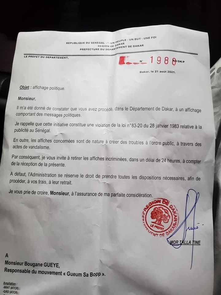 Bougane Guèye Dany a été convoqué ce matin à la police de la Sûreté urbaine de Dakar. Il est reproché au leader du mouvement Geum sa bop d’avoir procédé à des affichages contenant des messages politiques alors que c’est une activité punie par la loi. Dans le texte qui suit, le préfet demande à Bougane Guèye de retirer ses affiches.