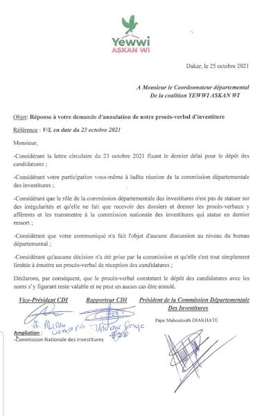 La crise ne fait que commencer au sein de la coalition Yewwi askan wi. Les parties ne s’entendent pas. La commission d’investiture vient de rejeter dans le document, ci-dessous, la demande d’annulation de la liste pour permettre à Soham El Wardini d’être à jour. La mairesse sortante avait été déclarée forclose.