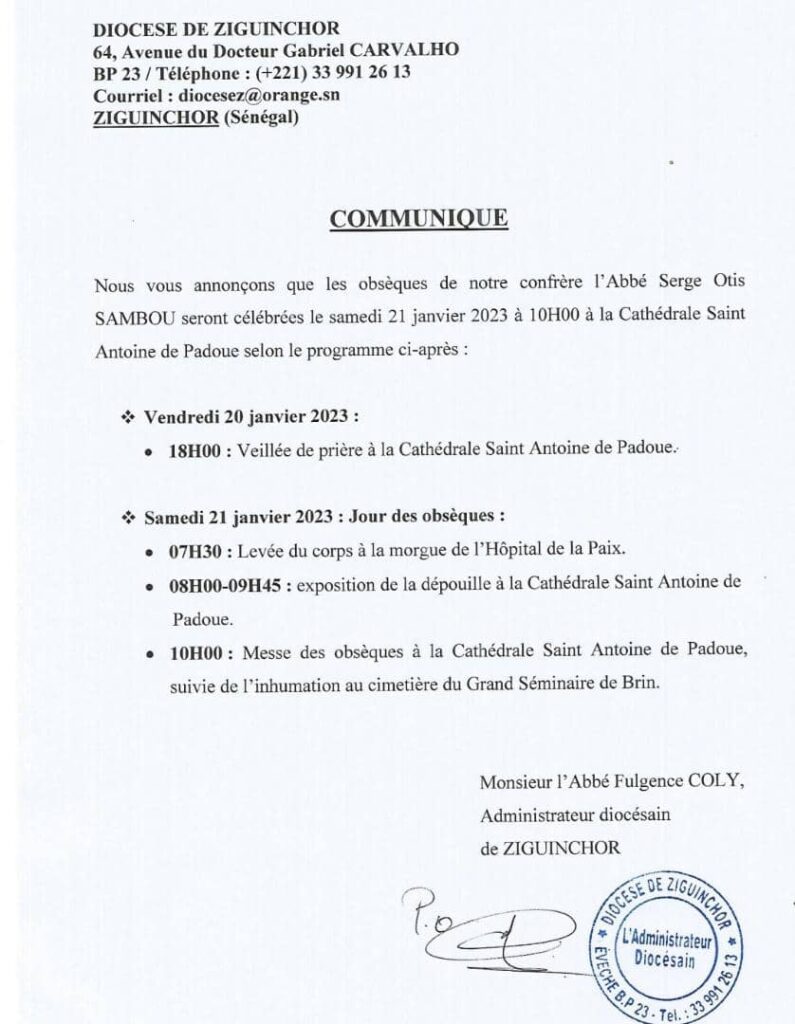 La date de l’inhumation du curé de la paroisse cathédrale Saint-Antoine de Padoue, l’abbé Serge Otis Sambou est connue. Ce sera le 20 janvier 2023.
